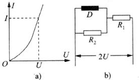 4.用半导体材料制成的电阻器D,它的I-U图像如下图a所示,将D与两个标准电阻R1、R2并联后接在电压恒为U的电源两端,三个用电器消耗的电功率均为P,现将它们连接在如下图b所示的电路中,接在电压恒为2U的电源两端,设三个电阻器都不会损坏,电阻器D和电阻R1、R2消耗的电功率分别是PD、P1、P2,它们之间的大小关系有