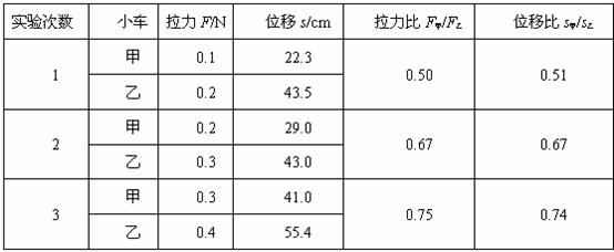 (2)(7分)在探究“牛顿第二定律”时,某小组设计双车位移比较法来探究加速度与力的关系.实验装置如下图所示,将轨道分上下双层排列,两小车后的刹车线穿过尾端固定板,由安装在后面的刹车系统同时进行控制(未画出刹车系统).通过改变砝码盘中的砝码来改变拉力大小.通过比较两小车的位移来比较两小车的加速度大小,是因为位移与加速度的关系式为 .已知两车质量均为200g,实验数据如表中所示: