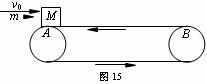 17.(12分)如图15所示,水平传送带AB长l=8.3m,质量为M=1kg的木块随传送带一起以v1=2m/s的速度向左匀速运动(传送带的传送速度恒定),木块与传送带间的动摩擦因数