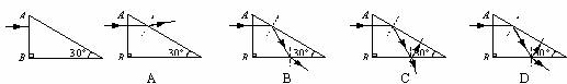 3.如图所示,一束光从空气垂直射到直角棱镜的AB面上,已知棱镜材料的折射率为1.4,则这束光进入棱镜后的光路图应为下面四个图中的 ( )