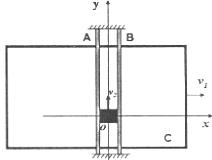 11.如图所示,质量为Ⅲ的长方体物块放在水平放置的钢板C上,物块与钢板间的动摩擦因数为Ⅳ,由于光滑固定导槽A、B的控制,该物块只能沿水平导槽运动.现使钢板以速度v1向右匀速运动,同时用水平力F拉动物块使其以速度v2(v2的方向与vl的方向垂直,沿y轴正方向)沿槽匀速运动,以下说法正确的是