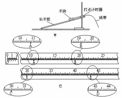 15.用铁架台将长木板倾斜支在水平桌面上,组成如图甲所示装置(示意图),测量木块沿面下滑的加速度。所提供的仪器有长木板、木块、打点计时器(含纸带)、学生电源、刻度尺、铁架台及导线、开关等。图乙是打点计时器打出的一条纸带,纸带上标注了O点和几个计数点A、B、C、D等,相邻两个计数点间还有4个点没有标出,纸带胖还给出了最小刻度为1mm的刻度尺,刻度尺的零点与O点对齐。已知打点计时器所用交流电源的频率是50Hz。