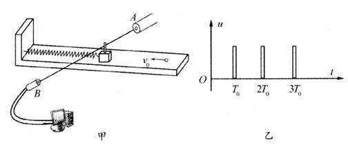 为弹簧的形变量)。为了验证弹簧的弹性势能公式,他设计了如下图甲所示的实验:轻弹簧的一端固定在水平光滑木板一端,另一端连接一个质量为M的滑块,滑块上竖直固定一个挡光条,每当挡光条挡住从光源A发出的细光束时,传感器B因接收不到光线就产生一个电信号,输入电脑后经电脑自动处理就能形成一个脉冲电压波形;开始时滑块静止在平衡位置恰好能挡住细光束,在木板的另一端有一个弹簧枪,发射出质量为