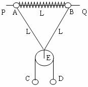 18. (10分) 如图所示,PQ为一固定水平放置的光滑细长杆,质量均为m的两小球A、B穿于其上,两小球用长度均为L的轻线连接,且被穿于杆上的轻弹簧相连.E为质量不计的光滑定滑轮,被两轻线悬挂,C、D球质量分别为m和2m用轻绳连接并跨过定滑轮。当C、D球运动时轻弹簧长度也为L,已知劲度系数为K,求弹簧的原始长度?(弹簧在弹性限度内,重力加速度为g)