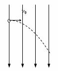 17.如下图所示,质量为m、电荷量为q的带电粒子,以初速度v0垂直射入场强为E方向竖直向下的匀强电场中,射出电场的即时速度的方向与初速度方向成30º角。在这过程中,不计粒子重力。
