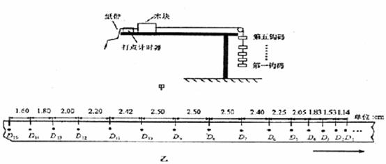 13.(15分)很多人都认为“力越小速度就越小”,为了检验这个观点是否正确。兴趣小组的同学设计了这样的实验方案:在水平桌面上放一小木块,小木块后端与穿过打点计时器的纸带相连,前段通过定滑轮与不可伸长的细线相连接,细线上不等间距地挂了五个钩码,其中第四个、第五个钩码之间的距离最大。起初木块停在靠近打点计时器的位置,第五个钩码到地面的距离小于木块到定滑轮的距离,如下图甲所示,启动打点计时器,木块在钩码的牵引下,由静止开始运动,所有钩码落地后,木块会继续运动一段距离。打点计时器使用的交流电频率为50Hz。下图乙是实验得到的从第一个钩码落地到所有钩码落地后木块连续运动一段距离的一段纸带,纸带运动方向如箭头所示(g取10m/s2)