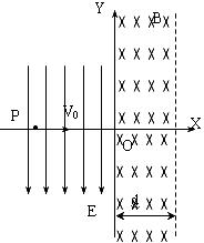 16.(18分)如图所示,坐标空间中有场强为E的匀强电场和磁感应强度为B的匀强磁场,y轴为两种场的分界面,图中虚线为磁场区的右边界。现有一质量为m、电量为-q的带电粒子,从电场中的P点以初速度V0沿x轴正方向开始运动,已知P点的坐标为(-L,0)且