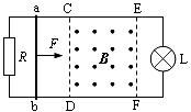 17.(22分)如图所示,水平面上有两电阻不计的光滑金属导轨平行固定放置,间距d为0.5 m,左端通过导线与阻值为2 W的电阻R连接,右端通过导线与阻值为4 W的小灯泡L连接,在CDEF矩形区域内有竖直向上的匀强磁场,CE长为2 m,CDEF区域内磁场的磁感应强度B随时间变化如图所示,在t=0时,一阻值为2 W的金属棒在恒力F作用下由静止开始从ab位置沿导轨向右运动,当金属棒从ab位置运动到EF位置过程中,小灯泡的亮度没有发生变化,求: