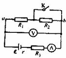12.如图所示电路中,电源电动势ε恒定,内阻r=1Ω,定值电阻R3=5Ω。当电键K断开与闭合时,ab段电路消耗的电功率相等,则以下说法中正确的有 ( )