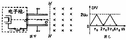OO′垂直。两平行金属板的电压U随时间t变化的图线如图乙所示(最高电压为2U0)。已知电子的带电量为q,质量为m,电子的重力和电子之间的作用力均可忽略不计。若t=t0时刻从O点飞入的电子恰能从平行金属板边缘离开电场(设在每个电子通过电场区域的时间内,可以把板间的电场看作是恒定的)而进入磁场,在磁场中运动后又恰从平行金属板另一边缘飞出,求: