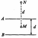 带有等量异种电荷的两个平行金属板A和B水平放置,相距d (d远小于板的长和宽),一个带正电的油滴M悬浮在两板的正中央,处于平衡,油滴的质量为m,带电量为q,如图所示。在油滴的正上方距A板d处有一个质量也为m的带电油滴N,油滴N由静止释放后,可以穿过A板上的小孔,进入两金属板间与油滴M相碰,并立即结合成一个大油滴。整个装置处于真空环境中,若不计油滴M和N间的库仑力和万有引力以及金属板本身的厚度,问