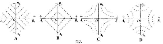 12.理论研究表明,无阻在的均匀带电平面在周围空间会形成与平面垂直的匀强电场。现有两块无阻大的均匀绝缘带电平面,一块两面正电,一块两面负电。把它们正交放置如甲图所示,单位面积所带电荷量相等(电荷在相互作用时不移动),图甲中直线A1B1和A2B2分别为带电平面和带负电的平面与纸面正交的交线的交点,O为两交线的交点,则图乙中能正确反映等势面分布情况的是