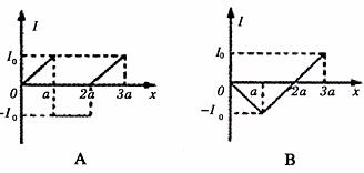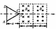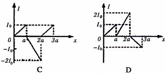 22.如下图所示,两个垂直纸面的匀强磁场方向相反,磁感应强度的大小均为B,磁场区域的宽度均为a,一正三角形导线框ACD(高为a),从图示位置沿图示方向匀速穿过两磁场区域,则下图中感应电流I(以逆时针方向为电流的正方向)与线框移动距离x的关系图象正确的是 ( )