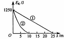 17.(12分)随着国际油价持续走高,能源危机困扰着整个世界、构建和谐型、节约型社会深得民心,节能器材遍布于生活的方方面面,自动充电式电动车就是很好的一例。电动车的前轮装有发电机,发电机与蓄电池连接,当骑车者用力蹬车或电动自行车滑行时,打开自动充电装置,自行车就可以连通发电机向蓄电池充电,将其他形式的能转化成电能储存起来.现有某人骑车以1250J的初动能在粗糙的水平路面上滑行,人车总质量为100kg.第一次关闭自动充电装置,让车自由滑行,其动能随位移变化关系如图线①所示;第二次启动自动充电装置,其动能随位移变化关系如图线②所示,设两次人和车所受阻力恒定。求: