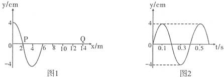 15.如下图1为一列沿X轴方向传播的简谐横波在t=0时刻的波动图像,下图2为质点P的振动图像,由此可知 ( )