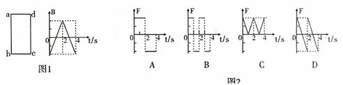 20.矩形导线框abcd放在匀强磁场中,在外力控制下静止不动,磁感线方向与线圈平面垂直,磁感应强度B随时间变化的图像如下图1所示,t=0时刻,磁感应强度的方向垂直纸面向里,在0~4s时间内,线框ab边受力随时间变化的图像(力的方向规定以向左为正方向)可能是下图2中的 ( )