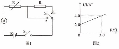 ②该同学已经测得电阻Rx=2.0Ω,继续测电源电动势E和内阻r的阻值,该同学的做法是:闭合S1,将S2切换到b,多次调节电阻箱,读出多组电阻箱示数R和对应的电流表示数I,由测得的数据,绘出了如图2所示的1/1-R图线,则电源电动势E= v,内阻r= Ω。