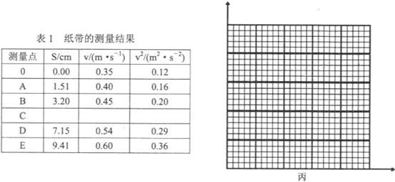 (2)如图乙是钩码总质量为0.02kg时得到的一条纸带,在纸带上选择起始点O及A、B、C、D和E五个计数点,测得各计数点到O的距离,并计算出对应时刻小车的瞬时速度v,请将C点的测量结果填在表1中的相应位置。