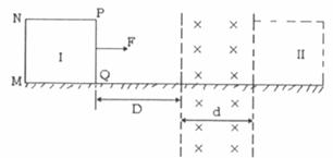 ,开始时放在光滑绝缘水平板上“I”位置,现用一水平向右的恒力F=0.8N拉线框,使其向右穿过磁场区,最后到达“II’’位置(MN边恰好出磁场)。设线框平面在运动中始终保持在竖直平面内,PQ边刚进入磁场后线框恰好做匀速运动。试求: