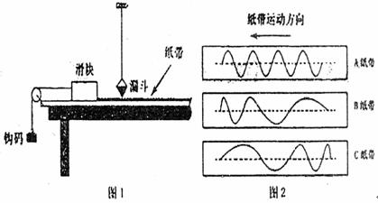 (2)(12分)某实验小组拟用如图1所示装置研究滑块的运动。实验器材有滑块、钩码、纸带、米尺、带滑轮的木板,以及由漏斗和细线组成的单摆等。实验中,滑块在钩码作用下拖动纸带做匀速加速直线运动,同时单摆垂直于纸带运动方向摆动,漏斗漏出的有色液体在纸带下留下的痕迹记录了漏斗在不同时刻的位置。