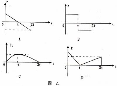 3.如图甲所示,一质量为m的滑块以初速度v0自固定于地面的斜面底端A开始冲上斜面,到达某一高度后返回A,斜面与滑块之间有摩擦,图乙中分别表示它在斜面上运动的动量P、加速度a、势能EP和机械能E随时间的变化图线,可能正确的是 ( )