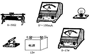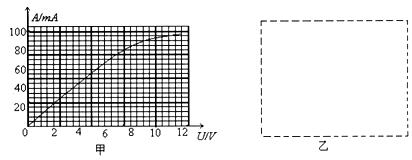 (2)(9分)某同学使用了如下器材:电源E(电动势12V);电压表V(量程为15V,内阻约15KΩ)电流表A(量程100mA,内阻约10Ω);滑动变阻器(最大电阻为50Ω);单刀单掷开关;导线若干。测出了一个小灯泡的伏安特性曲线如图甲所示,已知小灯泡的额定电压为12V。