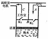 17.世界上第一盏用海浪发电的航标灯,其气室(器壁是导热的)结构示意如图。利用海浪上下起伏的力量,空气从A吸进来,在B中压缩后再推入工作室C,推动涡轮机带动发电机发电。当海水下降时,阀门