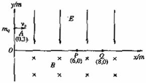 24.(18分)如图所示,在直角坐标系xoy的第一象限中分布着沿y轴负方向的匀强电场,在第四象限中分布着方向向里垂直纸面的匀强磁场. 一个质量为m、带电+q的微粒,在A点(0,3)以初速度v0=120m/s平行x轴射入电场区域,然后从电场进入磁场,又从磁场进入电场,并且先后只通过x轴上的p点(6,0)和Q点(8,0)各一次. 已知该微粒的比荷为
