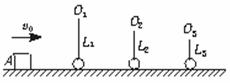 25. (20分)如图所示,滑块A的质量m=0.01 kg,与水平地面间的动摩擦因数μ=0.2,用细线悬挂的小球质量均为m=0.01 kg,沿x轴排列,A与第1只小球及相邻两小球间距离均为s=2 m,线长分别为L1、L2、L3…(图中只画出三只小球,且小球可视为质点),开始时,滑块以速度v0=10 m/s沿x轴正方向运动,设滑块与小球碰撞时不损失机械能,碰撞后小球均恰能在竖直平面内完成完整的圆周运动并再次与滑块正碰,g取10 m/s2,求:
