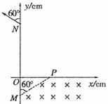 25.(18分)如下图所示,第四象限内有互相垂直的匀强电场E与匀强磁场B1,匀强电场大小E=0.5×103V/m,匀强磁场的方向垂直纸面向里,其大小B1=0.5T;第一象限的某个矩形区域内,有方向垂直纸面向里的匀强磁场B2,磁场的下边界与x同重合。一质量m=1×10-14kg、电荷量q=1×10-10C的带正电微粒,以某一初速度v沿与y轴正方向成60°角从M点进入第四象限后沿直线运动,在P点进入处于第一象限内的磁场B2区域。一段时间后,微粒经过y轴上的N点并以与y轴正方向成60°角飞出。M点的坐标为(0,-10),N点的坐标为(0,30),不计微粒重力,g取10m/s2。