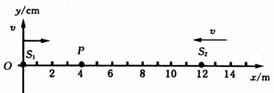21.如下图所示,均匀介质中两波源S1、S2分别位于x轴上x1=0、x2 =12m处,质点P位于x轴上x p =4m处。t=0时刻两波源同时开始由平衡位置向y轴正方向振动,振动周期均为T=0.l s,传播速度均为v=40m/s,波源S1和S2的振幅分别为A1= 2cm和A2= l cm。则在t=0至t=0.3s内质点P通过的路程为