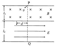 从磁场区域上边界的P点斜射入磁场,然后以垂直于电、磁场分界线的方向进入电场,最后从电场边界上的Q点射出,已知PQ垂直于电场方向,粒子轨迹与电、磁场分界线的交点到PQ的距离为d。不计重力,求电场强度与磁感应强度大小之比及粒子在磁场与电场中运动时间之比。