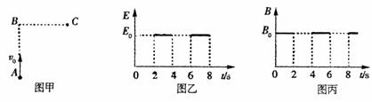 21.如图甲所示,空间中存在一个变化的电场和一个变化的磁场,电场的方向水平向右(图甲中由B到C),电场强度的大小随时间变化情况如图乙所示;磁感应强度方向垂直于纸面,磁感应强度的大小随时间变化情况如图丙所示,在t=1 s时,从A点沿AB方向(垂直于BC)以初速度v0射出第一个粒子,并在此之后,每隔2 s有一个相同的粒子沿AB方向均以初速度v0射出,射出的粒子均能击中C点,若AB=BC=l,粒子由A运动到C的时间均小于1 s. 不计粒子重力、空气阻力及电磁场变化带来的影响. 则以下说法正确的是 ( )