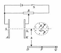 25.(21分)如图所示,在以O为圆心,半径为R的圆形区域内,有一个水平方向的匀强磁场,磁场的磁感应强度大小为B,方向垂直纸面向外。竖直平行正对放置的两金属板A、K连在电压可调的电路中。S1、S2为A、K板上的两个小孔,且S1、S2和O在同一直线上,另有一水平放置的足够大的荧光屏D,O点与荧光屏的距离为h。比荷(电荷量与质量之比)为k的带正电的粒子由S1进入电场后,通过S2射入磁场中心,通过磁场后打在荧光屏D上.粒子进人电场的初速度及其所受重力均可忽略不计.