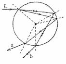 19.2009年初春北方出现历史罕见的旱情,不少地区采用人工降雨的方式来抗旱保苗。若某次降雨后天空出现了虹,如图所示虹是由阳光射入雨滴(视为球形)后,经一次反射和再次折射而产生的色散形成的,现有白光束L由图示方向射入雨滴,a、b是经过反射和折射后的其中两条出射光线,下列说法中正确的是 ( )