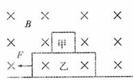 21.如图所示,甲带正电,乙是不带电的绝缘物块,甲乙叠放在一起,置于粗糙的水平地面上,面板上方空间有垂直纸面向里的匀强磁场,现用一水平恒力F拉乙物块,使甲、乙无相对滑动一起向左加速运动,在加速运动阶段,下列说法正确的是 ( )