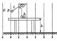 24.(19分)如图所示,两个形状、大小相同的钢球A、B,A球质量为1.5kg, B球质量为0.5kg。开始A球不带电,静止在高h=0.88m的光滑平台上,B球带0.3C的正电荷,用长L=1m的细线悬挂在平台上方,整个装置放在竖直向下的匀强电场中,场强大小E=10N/C.现将细线拉开角度α=60°后,由静止释放B球,B球在最低点与A球发生对心碰撞,碰撞时无机械能损失,不计碰后A、B球的库仑力,不计空气阻力,取g=10m/s2,求: