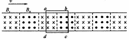 24.(18分)磁悬浮列车动力原理如下图所示,在水平地面上放有两根平行直导轨,轨间存在着等距离的正方形匀强磁场Bl和B2,方向相反,B1=B2=lT,如下图所示。导轨上放有金属框abcd,金属框电阻R=2Ω,导轨间距L=0.4m,当磁场Bl、B2同时以v=5m/s的速度向右匀速运动时,求