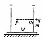 25.(22分)如图所示,电容为C、带电量为Q、极板间距为d的电容器固定在绝缘底座上,两板竖直放置,总质量为M,整个装置静止在光滑水平面上。在电容器右板上有一小孔,一质量为m、带电量为+q的弹丸以速度v0从小孔水平射入电容器中(不计弹丸重力,设电容器周围电场强度为0),弹丸最远可到达距右板为x的P点,求: