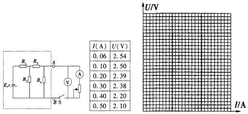 18.(8分)虚线方框内是由电阻、电源组成的线性网络电路,为了研究它的输出特性,将电流表、电压表、滑动变阻器按图示的方式连接在它的输出端A、B之间。电键S闭合后,实验中记录的6组电流表示数I、电压表示数U如下表所示。