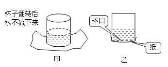 20.(10分)有位同学做了个小实验,他在杯中放了半杯水,找了一张普通的纸盖在杯口光滑平整的玻璃杯上,按住纸翻转杯子、松开手,他惊呆了:水居然不流下来,如图甲所示。已知玻璃杯粗细均匀,杯子内底部到杯沿的高度为12cm,杯中水的高度为6cm,大气压强为1.013×105Pa。该同学在经过仔细观察后发现,翻转后,纸略往下凸,其平均下凸高度为0.35×10-3m(见乙图),g取9.8m/s2。请你通过计算说明水不流下来的原因。