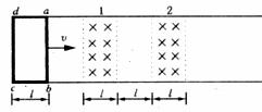 25.(19分)如图所示,在光滑绝缘的水平面上.有两个竖直向下的匀强磁场区域1、2 ,磁场的宽度和两个区域之间的距离均为l ,磁感应强度均为B0。一矩形金属线圈其ab边长为2l ,bc边长与磁场宽度相等,也为l 。它以初速度v=10v0进入第一个磁场区域,已知cd 边离开第一个磁场区域时速度为9v0。求: