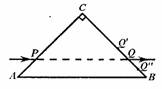 16.一个等腰直角三棱镜的截面如图所示,一细束蓝光从AC面的P点沿平行底面AB方向射入棱镜后,经AB 面反射,再从BC面的Q 点射出,且有PQ//AB (图中未画光在棱镜内的光路)。如果将一细束红光仍从P 点沿平行底面AB方向射入三棱镜,则从BC面射出的光线 ( )
