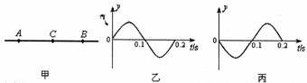 19.如图甲所示,同一水平直线上相距6 m的A、B两处各有一个振源,C为A、B连线的中点。在t0=0时刻,A、B两处的质点以相同的振幅同时开始做垂直于直线AB的上下振动,且都只振动了一个周期,它们的振动图象分别为图乙和图丙。若A处振源向右传播的波与B处振源向左传播的波,在t1=0.3 s时刻于C点相遇,则