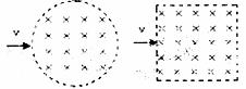 20.如下图所示,两个匀强磁场横截面分别为圆形和正方形,内部磁感应强度大小均为B,方向均垂直于纸面向里,圆的直径D等于正方形的边长。两个完全相同的带电粒子同是以相同的速度v分别飞入两个磁场区域,速度方向均与磁场方向垂直,进入圆形区域的带电粒子速度方向对准了圆心,进入正方形区域的带电粒子是沿一边的中心无助于垂直于边界线进入的,则 ( )