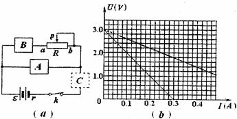 (III)某同学在用图(a)所示的电路做“测电源电动势和内电电阻”的实验时,A处为电压传感器,B处为电流传感器。甲同学在C位置直接用导线连接进行实验,乙同学则在C位置串联一个保护电阻R0进行实验,其它部分完全相同。他们将两次实验所得的数据用图线形式画在同一张U-I图线上,如图(b)所示。(结果保留两位有效数字)