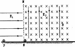 25.(20分)如下图所示,水平光滑绝缘地面上方虚线MN左侧存在水平向右的匀强电场,电场强度E1=1.0N/C,右侧存在着竖直向上、电场强度E2=50N/C的匀强电场和垂直纸面向里、磁感应强度B1=5.0T的匀强磁场,场区竖直方向均足够在。有两个完全相同的金属小球A、B,质量均为0.10g,A带正电,电量大小为4.0×10-5C,B不带电。现将小球A在P点由静止释放,当A运动到N点与静止在N点的小球B碰撞,PN=0.2m,A、B碰撞时间极短,碰撞过程中无能量损失。球的大小忽略不计。(g取10m/s2)