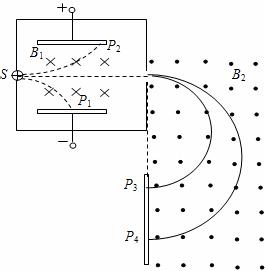3.如图所示为质谱仪测定带电粒子质量的装置的示意图。速度选择器(也称滤速器)中场强E的方向竖直向下,磁感应强度B1的方向垂直纸面向里,分离器中磁感应强度B2的方向垂直纸面向外。在S处有甲、乙、丙、丁四个一价正离子垂直于E和B1入射到速度选择器中,若m甲= m乙< m丙= m丁,v甲< v乙= v丙< v丁,在不计重力的情况下,则分别打在P1、P2、P3、P4四点的离子分别是