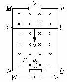 8.图中MN和PQ为竖直方向的两平行长直金属导轨,间距l=0.40m,电阻不计。导轨所在平面与磁感应强度B=0.50T的匀强磁场垂直。质量m=6.0×10-3kg、电阻r=1.0Ω的金属杆ab始终垂直于导轨,并与其保持光滑接触。导轨两端分别接有滑动变阻器和阻值为3.0Ω的电阻R1。当杆ab达到稳定状态时以速率v=4.5m/s匀速下滑,试求滑动变阻器接入电路部分的阻值R2和整个电路消耗的电功率P。取重力加速度g =10m/s2。