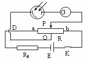 (2)图中光电管用金属材料铯制成,电路中定值电阻R0=0.75Ω,电源电动势E=1.5V,内阻r=0.25Ω,图中电路在D点交叉,但不相连。R为变阻器,O是变阻器的中间抽头,位于变阻器的正中央,P为滑动端.从变阻器的两端点ab可测得其总阻值为14Ω.当用上述氢原子两能级间跃迁而发射出来的光照射图中的光电管,欲使电流计G中电流为零,变阻器aP间阻值应为多大?已知普朗克常量h=6.63×10-34J·s,金属铯的逸出功为1.9eV.